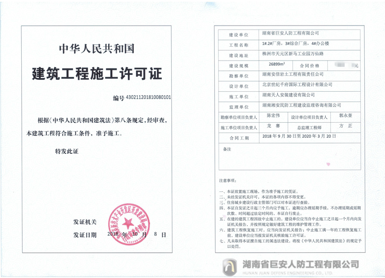 我司新廠建設獲得《湖南省建筑工程施工許可證》。