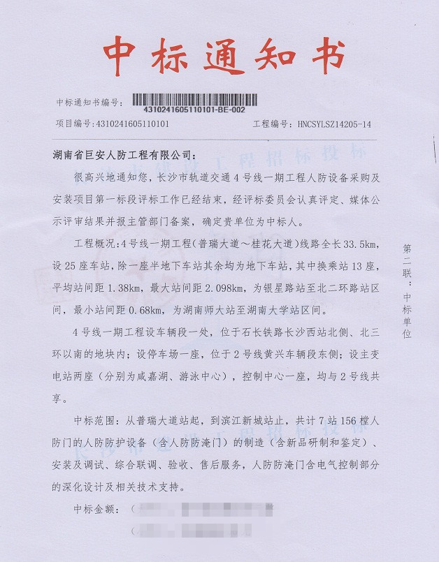 熱烈祝賀我司成功中標(biāo)長沙市軌道交通4號線一期工程人防設(shè)備采購及安裝項目第一標(biāo)段。該項目的中標(biāo)不僅展示了公司的實力也展示了我司的核心競爭力。一直以來,公司以“優(yōu)化管理,提高人防設(shè)備質(zhì)量;持續(xù)改進,滿足所有客戶需求”為質(zhì)量方針,堅持科學(xué)化管理,按照ISO9001:2008質(zhì)量管理體系要求,不斷提升品質(zhì),不斷優(yōu)化服務(wù),獲得用戶一致好評。 如今,面對機遇和挑戰(zhàn),公司將以“團結(jié)拼搏、敢于奉獻、開拓創(chuàng)新、唯先是奪”的精神,一如既往的為國家人防建設(shè)事業(yè)提供優(yōu)質(zhì)的人防工程防護設(shè)備產(chǎn)品和一流的安裝及售后服務(wù),愿與國內(nèi)同仁精誠合作,攜手共創(chuàng)鋼鐵長城的美好家園。 |