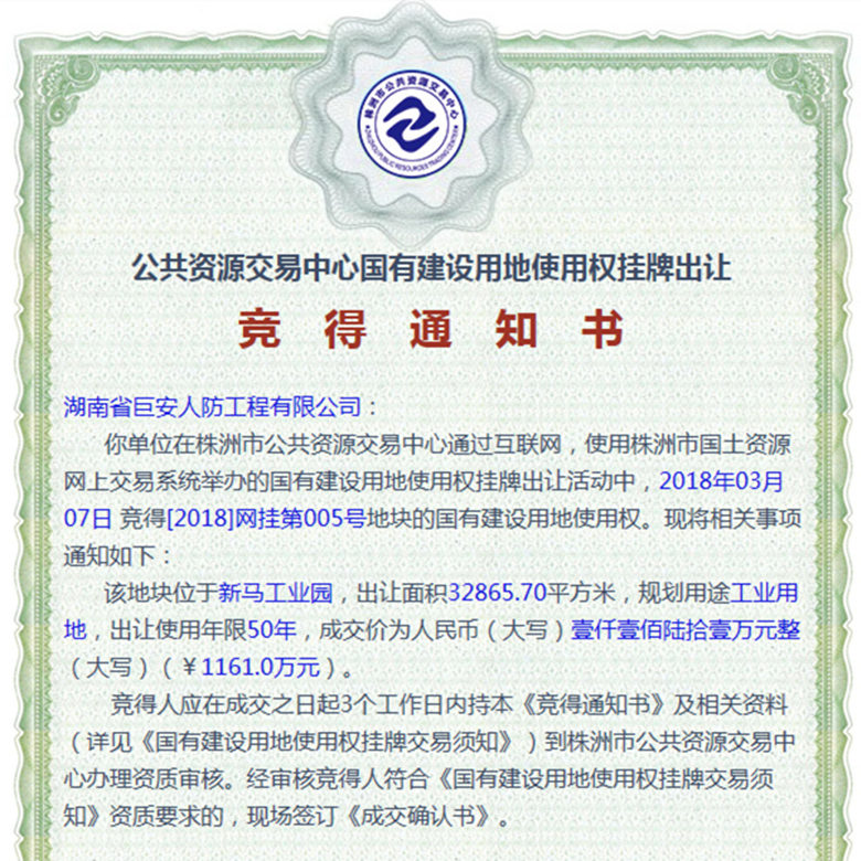 公共資源交易中心國(guó)有建設(shè)用地使用權(quán)掛牌出讓競(jìng)得通知書(shū)